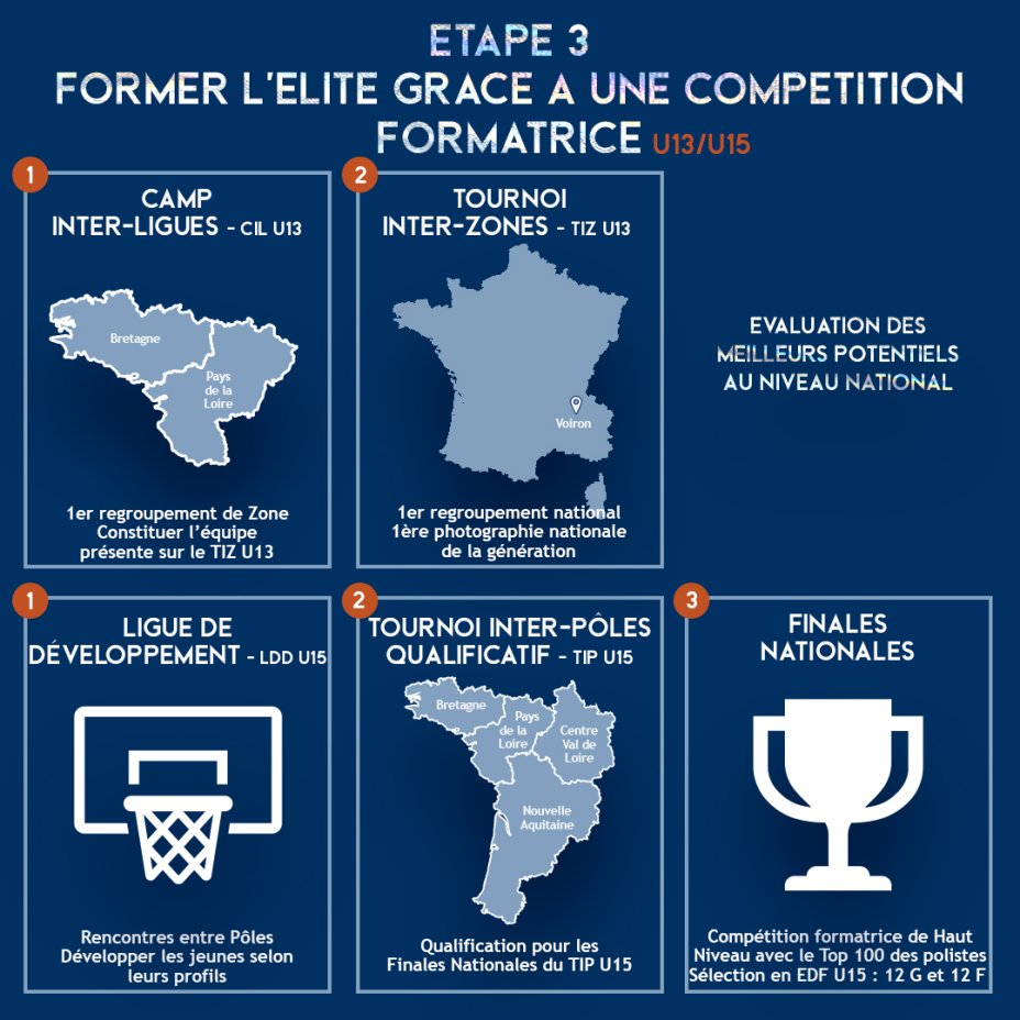 - Etape 3 : Etape formatrice qui permet aux potentiel(le)s d’évoluer dans un cadre de rencontres/compétitions de haut niveau